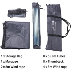 Aurinkokatos on helppo koota ja purkaa, ja se vie hyvin vähän tilaa kuljetuksen aikana. Mukana kuljetuslaukku.