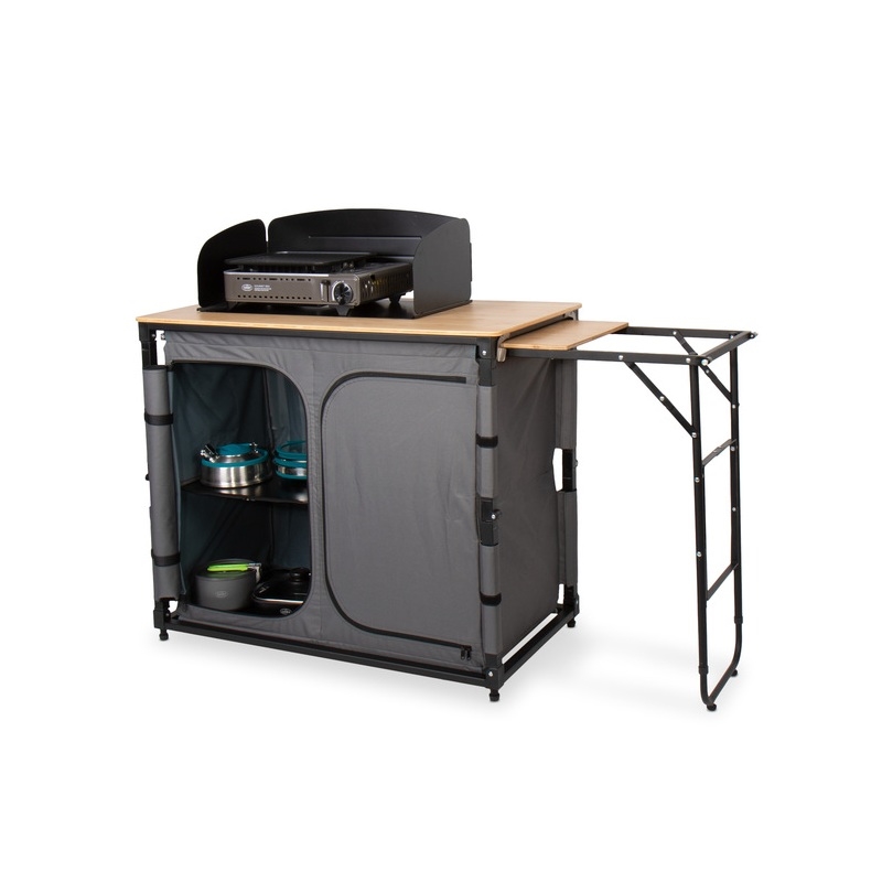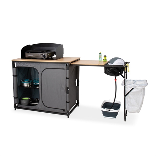 Tämä campingkeittiö yhdistää älykkään säilytyksen käytännölliseen ruoanlaittoon. Sisäänrakennettu säilytysyksikkö pitää kaikki keittiötarvikkeet järjestyksessä ja helposti saatavilla. Integroitu pesuallas ja vedenpoisto tekevät tiskaamisesta helppoa, kun taas ulosvedettävä sivupöytäosa antaa sinulle lisätyötilaa. Bambustyötaso varmistaa kestävän ja helposti puhdistettavan pinnan.