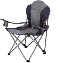 Mukava, pehmeä retkeilytuoli, jonka käsinojassa on mukiteline.