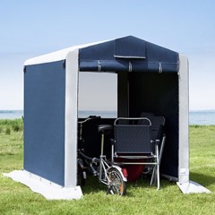 Hihnan solki on jo kiinnitetty kaikkiin osa- ja markiiseihin. Kiristys tapahtuu vakaan kiristysjousen avulla, joka säätelee valjaiden kireyttä, ja rautanaula antaa tarvittavan vakauden. Erittäin tehokas myrskysuoja.
