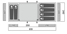 • Mitat: 610 cm pituus 240 cm leveys 195 cm korkeus