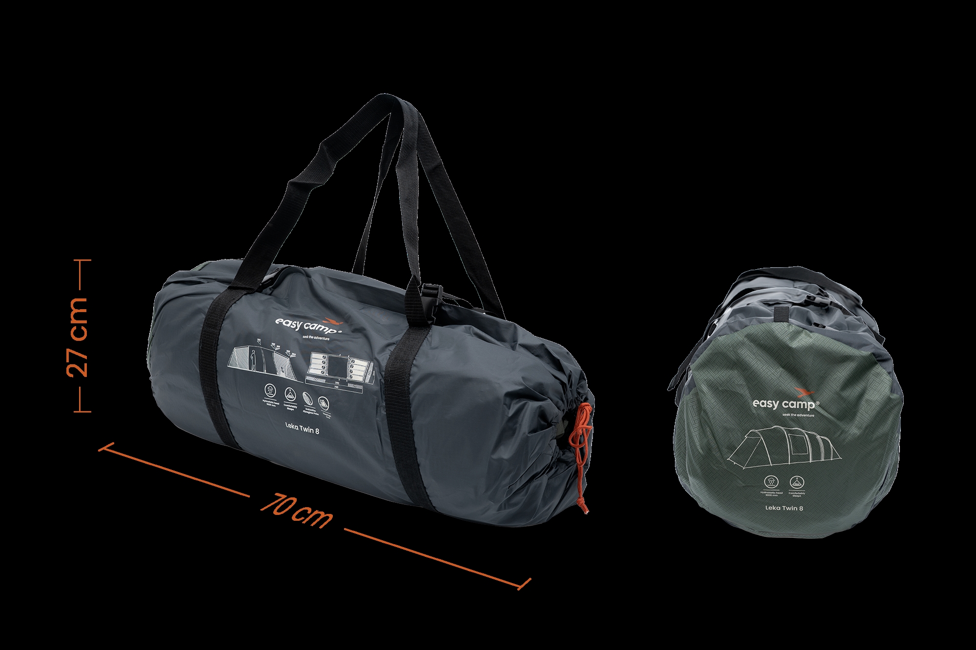 Easy Camp - Leka Twin 8 erottuu 3000 mm vesipilariarvolla ja teipatuilla saumoilla. Tämä takaa suojan sateelta perheleireillä, partiolaisleireillä ja festivaaleilla. Teltassa on tilaa 8 hengelle jaettuna 2 suureen erilliseen makuutilaan ja 1 oleskelutilaan. Pohjaratkaisu tarjoaa yksityisyyttä suurille perheille, jotka leireilevät yhdessä. Kaksinkertaisesti päällystetty polyeteenitelttapohja suojaa maan kosteudelta. Teltan ulkokuori on valmistettu WeatherGuard 3000 polyesteristä PU-pinnoitteella ja paloa hidastavalla käsittelyllä. Hengittävästä polyesteristä valmistettu sisäteltta estää kondensaatiota pidemmässä käytössä. Väritetyt tangot ja tangon taskut helpottavat pystytystä leireillä, leirintäalueilla ja festivaalialueilla. Kaksi sisäänkäyntiä, yksi kummallakin puolella, parantavat saavutettavuutta, kun useita henkilöitä liikkuu samanaikaisesti sisään ja ulos. Teltan paino on 16,9 kg, mikä on hallittavissa pitkän matkan kalustoa kuljettaville.