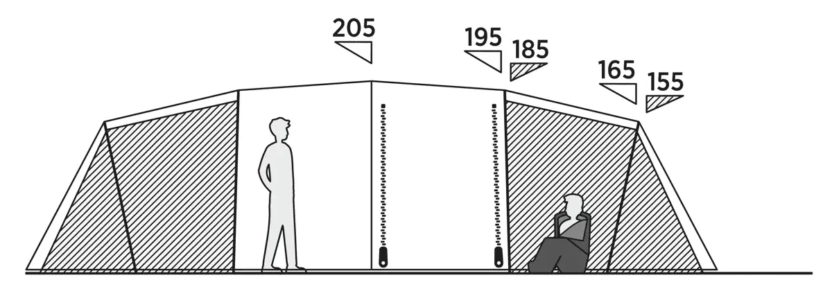 Teltassa on säädettävä tuuletus molemmissa päissä, mikä mahdollistaa ilmavirran säätelyn sääolosuhteiden mukaan. Sisäteltan sisäänrakennetut verkkopaneelit takaavat ilmankierron, samalla kun ne pitävät hyönteiset ulkona. Tämä on tärkeää lämpiminä kesäiltoina leirintäalueilla, kun lämpötila voi nousta. Molemmilla puolilla on ikkunat, joissa on rullaverhot, jotka voivat avata lisävaloa varten tai sulkea yksityisyyden varmistamiseksi. Hengittävän polyesterin yhdistelmä sisäteltassa ja säädettävässä ilmanvaihdossa minimoi kondensaatiota, joka voisi muuten kerääntyä makuutiloihin pidemmässä käytössä. Seisomakorkeus oleskelutilassa mahdollistaa luonnollisen liikkumisen sisällä. Kattokoukut lyhtyille ja taskut sisäteltan molemmilla puolilla tarjoavat käytännöllistä säilytystilaa ja valaistusta ilman, että ne vievät lattiatilaa.