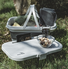 Tämä kori yhdistää ruoan kuljetuksen ja käytännöllisen ruokailutilan yhteen kompaktissa tuotteessa. Kansi toimii pienenä piknikpöytänä, jossa on syvennykset juomalaseille ja rako, johon voi asettaa kännykän tai tabletin. Taitettava rakenne tekee siitä helpon pakata kokoon pakkaukseksi, joka on 47 x 29 x 9,5 cm, kun taas paino 1.325 g takaa helpon kuljetuksen ja käsittelyn rannalle tai festivaalille.