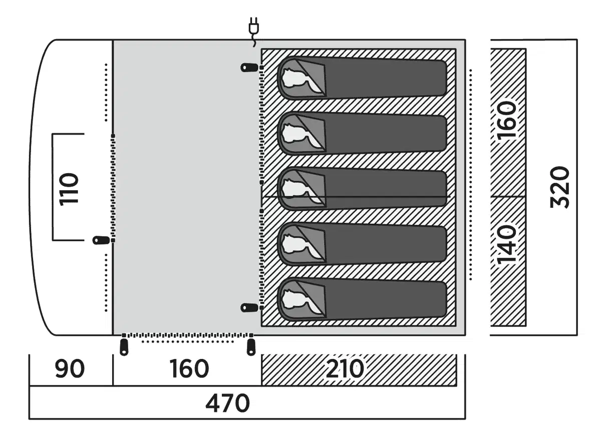 Tunnelirakenne tarjoaa ylimääräistä tilaa ja luo kodikkaan ilmapiirin leirintämatkan aikana. Kahden makuuhuoneen ja oleskelutilan varmistavat, että perheellä on sekä yksityisyyttä että yhteinen alue kokoontua. 195 cm:n seisomakorkeus tarkoittaa, että aikuiset voivat liikkua joutumatta kumartumaan, mikä tekee pidemmistä oleskeluista huomattavasti mukavampia. Yhdistelmä tilavaa sisustusta ja käytännöllistä toiminnallisuutta tekee Skarvan 5:stä sopivan perheille, jotka haluavat sekä tilaa että mukavuutta leirintäalueella.