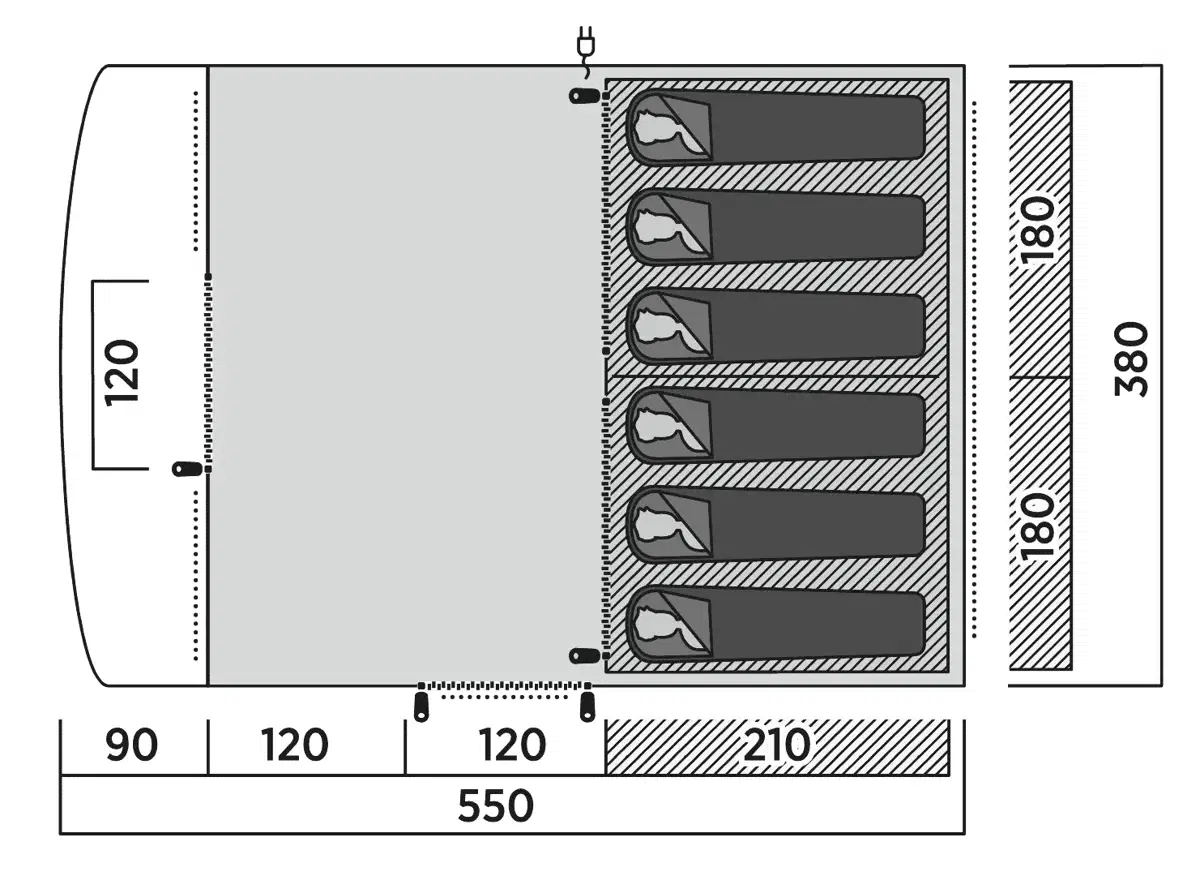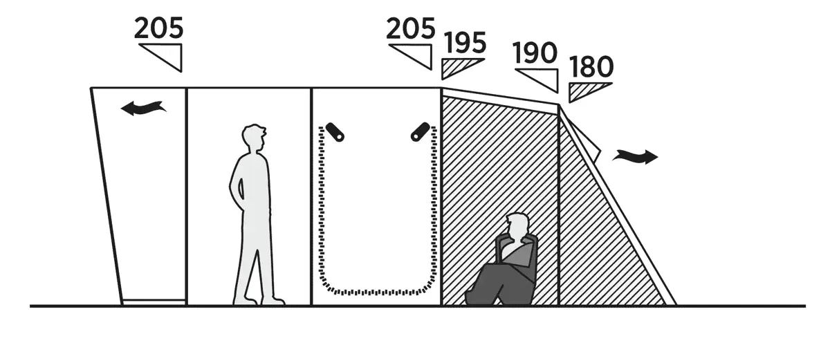 Skarvan 6:n oleskelutilassa on 205 cm seisomakorkeus. mikä mahdollistaa vaivattoman liikkumisen sisätiloissa ilman jatkuvaa kumartelua. Tämä on erityisen tärkeää, kun perhe viettää aikaa teltassa huonolla säällä tai illalla. Ikkunat edessä ja sivuilla verhoilla antavat hallita valon määrää ja ilmanvaihtoa, kun taas makuutilan irrotettava väliseinä mukauttaa huonejärjestelyä tarpeen mukaan. Organisointitaskut sekä oleskelutilassa että sisäteltassa pitävät varusteet ja henkilökohtaiset tavarat käden ulottuvilla. Suuri sivusisäänkäynti täysin mesh-ovella toimii lisäilmanvaihtokohteena ja tarjoaa helpon pääsyn ilman, että tarvitsee avata pääsisäänkäyntiä.