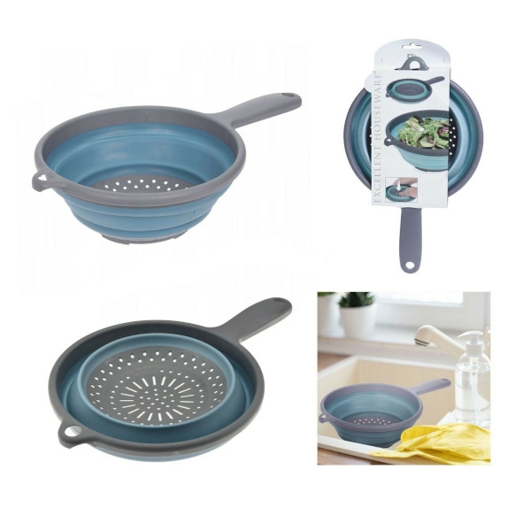 EH Oviluukku/siivilä, kokoontaitettava, kahvalla, sininen/harmaa