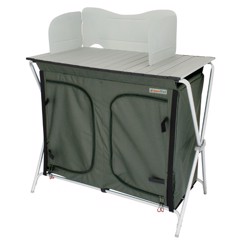 Jos etsit käytännöllistä ratkaisua ruoanlaittoon leirintämatkalla, tämä keittiöpöytä on suunniteltu tarpeisiisi. Kahdella erillisellä säilytystilalla, joista toisessa on kaksi hyllyä, voit pitää ruoat ja keittiötarvikkeet järjestyksessä ja helposti saatavilla. Alumiinilevy kestää kaasukeittimien lämpöä ja on helppo puhdistaa käytön jälkeen. Teräksinen tuulensuoja suojaa tuulisilta olosuhteilta, jolloin voit valmistaa ruokaa tehokkaasti säästä riippumatta.