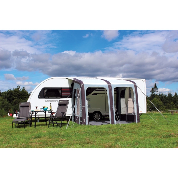 Ilmatäytteinen etuteltta asuntovaunun vieressä nurmikolla, läpinäkyvillä paneeleilla ja istuimia ulkona.