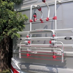 Älykäs uusi kuivausteline, joka on helppo asentaa asuntovaunun tai matkailuauton takaosassa olevaan pyörätelineeseen.