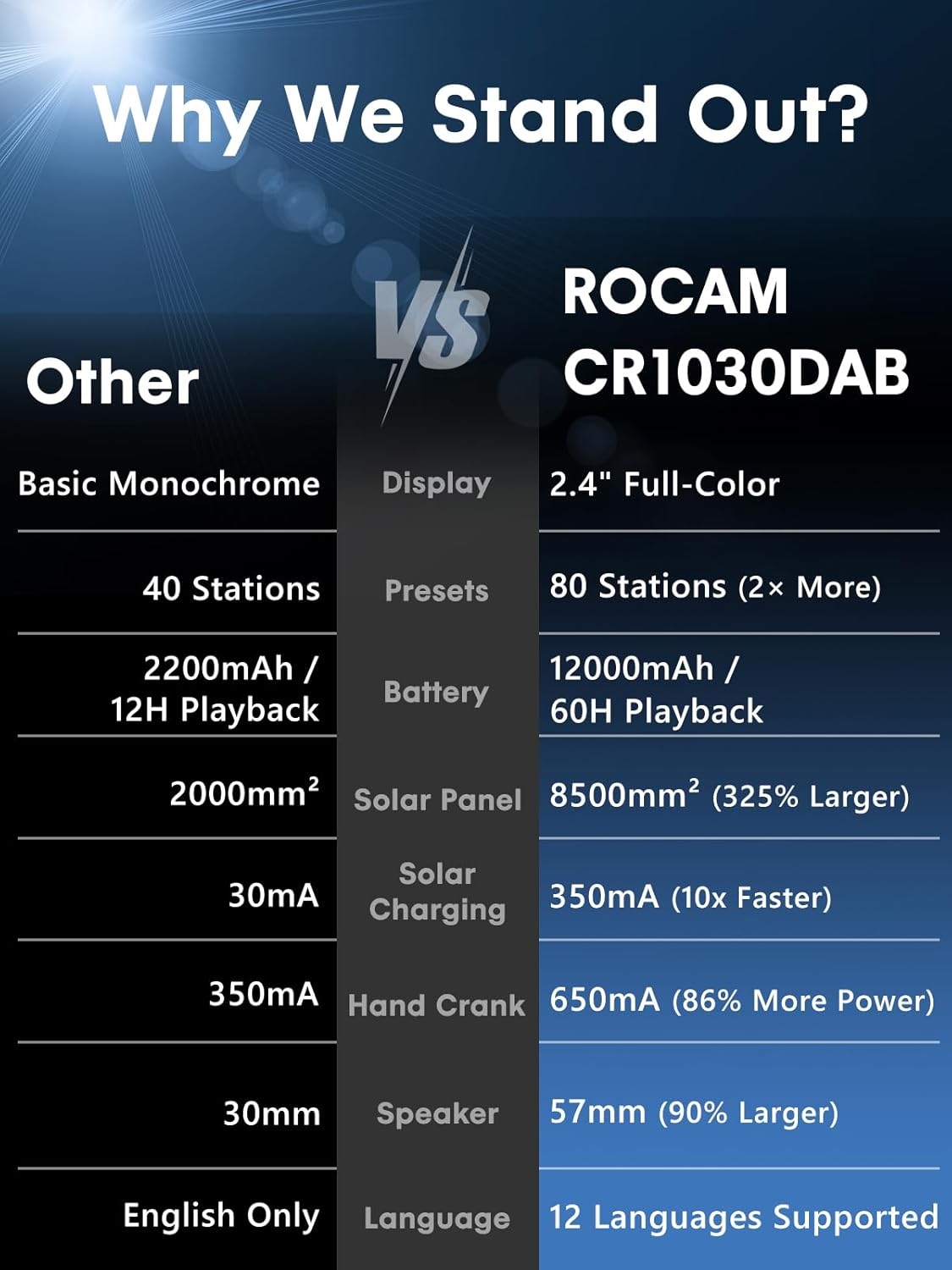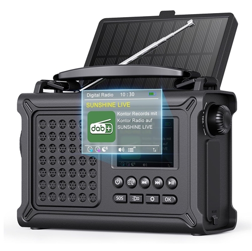 8500 mm² aurinkopaneeli ja 650 mA käsivipu antavat sinulle mahdollisuuden tuottaa virtaa, vaikka olet kaukana sähköpistorasioista. 80 muistitilaa (40 DAB+, 40 FM) tarkoittaa, että löydät nopeasti sääennusteita ja uutisia. 2,4 HD-värinäyttö näyttää lähettimen, taajuuden ja signaalivoimakkuuden, jotta tiedät tarkalleen, mitä vastaanotat. 57 mm kaiuttimet tarjoavat selkeää stereoääntä.
