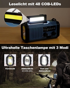 Kevyt ja kokoontaitettava valo: Aurinkoradiossa on taskulamppu ja lukuvalo, kirkkausasetuksia on kaksi: suuri kirkkaus tai normaali kirkkaus. Kirkas taskulamppu voi antaa sinulle valoa ja paremman näkyvyyden pimeässä, ja taittuva lukuvalo voi säätää kulmaa helppoa yölukemista varten. Täyttää erilaiset yökäytön tarpeesi.