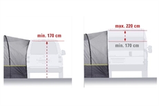 Liitäntäleveys 200 cm sopii useimpiin camper-tyyppeihin. 11 mm lasikuitu- ja 19/16 mm terästangot varmistavat vakauden, kun taas lahonkestävä polyetyleeni pohjaläppä suojaa kosteudelta. Kaksoiskador-nauha 5,8/7,2 mm ja SBS-vetoketju nro 8 tarjoavat luotettavan avaamisen ja sulkemisen. Teltta on monipuolinen matkailuteltta, joka on suunniteltu sekä viikonloppumatkoille että pidemmille oleskeluille, joissa antelias seisomakorkeus 2,1 metriä tarjoaa hyvän liikkumisvapauden.