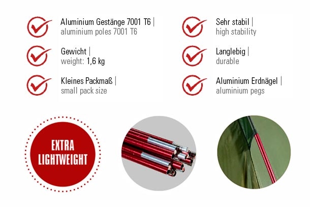 1,35 kg:n paino ilman tarvikkeita tarkoittaa, että teltta ei kuormita reppuasi pidemmillä vaelluksilla. 3000 mm:n vedenpitävyys suojaa sinua sateelta - vertailun vuoksi 1500 mm katsotaan vähimmäisiksi vedenpitävyydeksi, joten tämä teltta pärjää myös rankkasateissa. Kolme säädettävää ja 5 pysyvää ilmanvaihtoaukkoa on aina oltava auki, jotta varmistetaan ilmavirtaus ja estetään kondensaatio sisällä. 7001 T6 -alumiininen telttaisa (erittäin korkea murtolujuus) tekee pystytyksestä nopean ja helpon, jopa silloin, kun olet väsynyt pitkän päivän jälkeen. Sisäänommeltu telttapohja eliminoi raot, joista hyönteiset voivat tunkeutua sisään. Teltta on "single layer" -teltta, joten ei vaivaa sisäteltan kanssa, joka olisi myös pystytettävä.