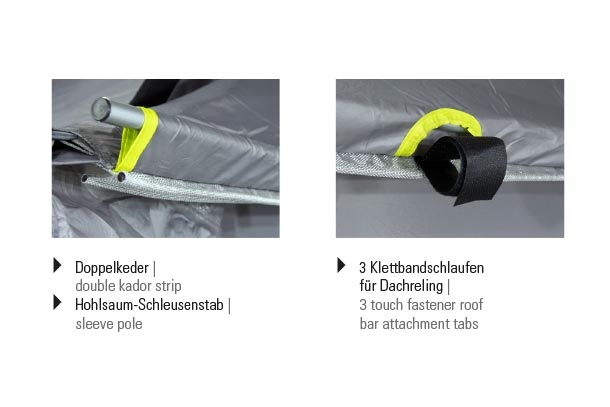 • Kaksinkertainen Kador / vulst 5,8/7,2 mm, joka sopii useimpiin kiinteisiin telttakiskoihin.