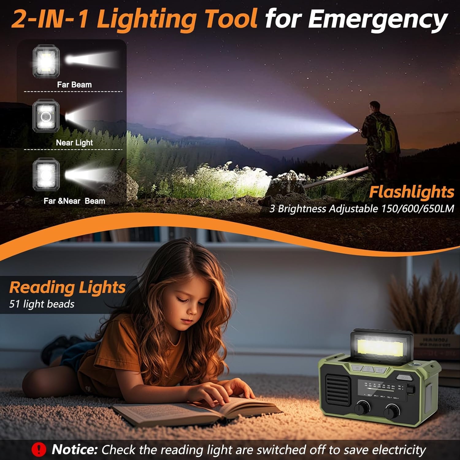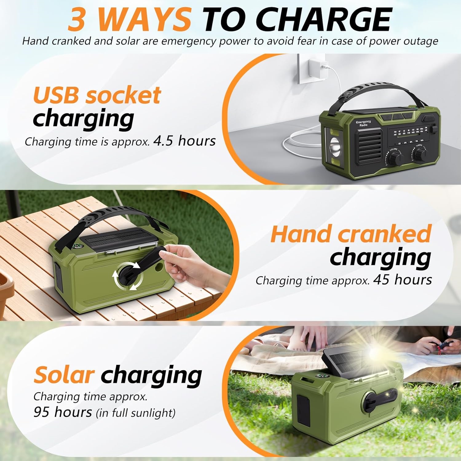 Tämä kestävä hätäradio, jossa on erittäin suuri 27.000 mAh powerbank, varmistaa luotettavan virtalähteen ja viestinnän, kun se on kaikkein kriittisintä. Kolmen latausvaihtoehdon kautta, USB:n, käsikammen ja aurinkopaneelin avulla, varmistetaan, että sinulla on aina pääsy sähköön - jopa pitkittyneiden sähkökatkosten aikana. Radio kattaa sekä FM:n että AM:n, joten voit vastaanottaa tärkeitä hätäilmoituksia ja pysyä ajan tasalla. Bluetooth 5.3:n ja 3,5 mm kuulokeliitännän avulla sinulla on joustavat mahdollisuudet liittää ulkoisia laitteita. Sisäänrakennettu SOS-sireeni ja kolme LED-valaistustilaa tarjoavat lisäturvallisuutta kriittisissä tilanteissa. Kestävä muotoilu ja sisäänrakennettu kompassi tekevät laitteesta ihanteellisen sekä valmiustilaan että ulkoilma-aktiviteetteihin.