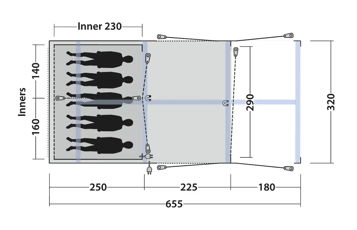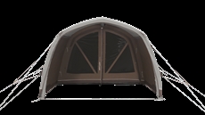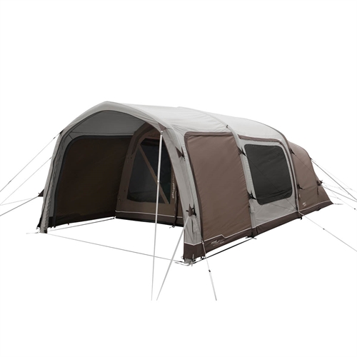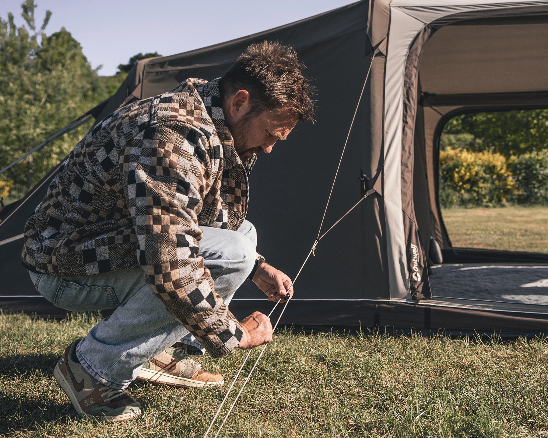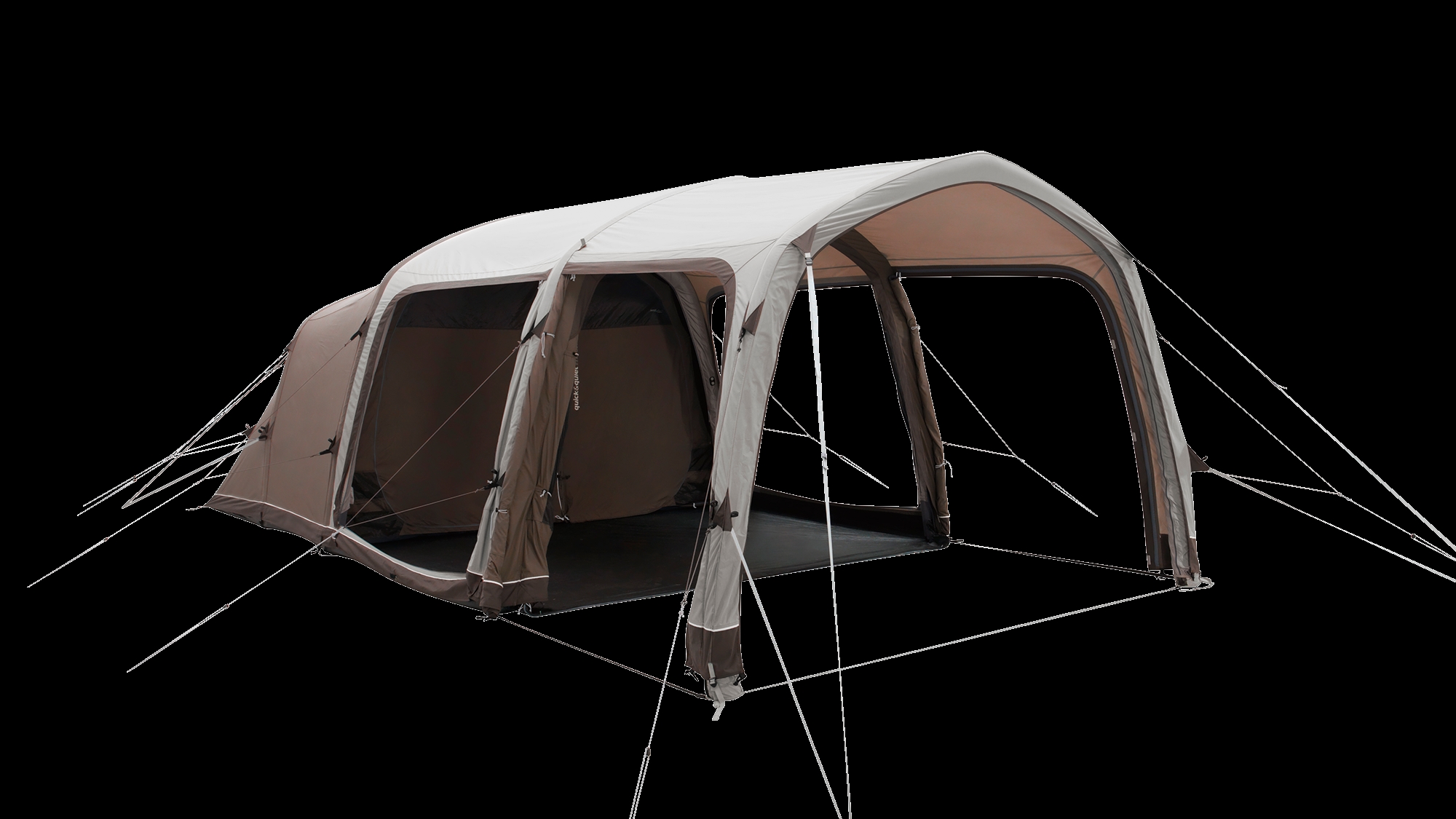 Ilmajärjestelmä käyttää esimuotoiltuja putkia, jotka puhalletaan yksittäisestä venttiilipisteestä. Yhdeksän minuutin kuluttua teltan pääasiallinen rakenne on pystyssä, ja 11 minuutin lisäajan jälkeen kaikki yksityiskohdat ovat kunnossa. Järjestelmä poistaa tarvetta koota keppejä ja työntää niitä kanavien läpi, mikä perinteisesti on ollut teltan pystytyksen aikaa vievin osa. Kaksi Ambassador-makuuhuonetta ovat 230 cm pitkät ja niissä on lisätummennuskangas sekä verkkotuuletus yläosassa. Olohuoneessa on integroitu Outwell Light System himmennettävällä valaistuksella, joten valaistus voidaan säätää tarpeen mukaan illalla. Etuseinä yhdistää verkon ja PVC-ikkunat erillisillä verhoilla, mikä antaa hallinnan sekä ilmavirran että yksityisyyden suhteen. Sivudoorit sisältävät hyönteissuojaverkon, joten säilytystiloihin pääsee avaamatta hyönteisiä itse telttaan. Lämpimän sävyinen ulkokaton materiaali päästää enemmän valoa läpi kuin tummemmat materiaalit, luoden kirkkaamman ilmapiirin sisälle päiväsaikaan. Verkko taskut sisäteltassa tarjoavat säilytystilaa puhelimille, taskulampuille ja muille pienille esineille, jotka muuten helposti katoavat telttaan. Teltta painaa 35 kg kaikkine komponentteineen, ja pakkauskoko 88 x 43 x 50 cm vaatii todennäköisesti auton, jossa on riittävästi tavaratilaa kuljetukseen, mutta et saa parempaa leirikokemusta kuin tämän teltan kanssa.