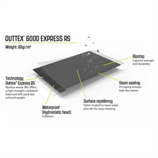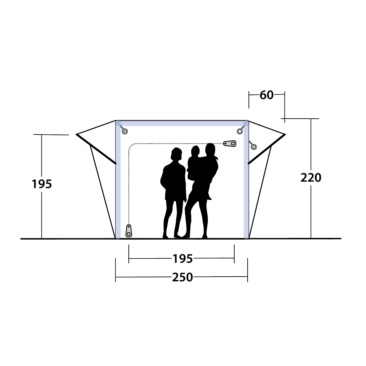 Teltta painaa 23,1 kg ja mitat ovat 78 x 37 x 41 cm taitettuna. Ilmaputket tarjoavat hyvän kattokorkeuden ja tilan tunnun kattoyhteydellä, joka on 250 cm. Etuseinä voidaan avata kokonaan tai osittain verkkopaneelilla takana, mikä tarjoaa joustavuutta ilmanvaihdon ja näkymän suhteen. Korkealaatuinen Outtex 6000 Express RS-materiaali, jossa on 6000 mm vesipilaripaine, suojaa sadetta ja kosteutta vastaan. Ompelemalla kiinnitetty pohja pitää hyönteiset ulkona, kun taas UPF 30+ suojaus suojaa auringon säteiltä. HookTrack-järjestelmä sallii valojen ja varusteiden ripustamisen 1,5 kg asti, ja esiasennettuja heijastavia naruja tekee pystytyksestä helppoa. Teltassa on käytännöllisiä yksityiskohtia, kuten vahvat, luotettavat vetoketjut ja lattiamatto, jossa sisäänrakennettu vedonesto.