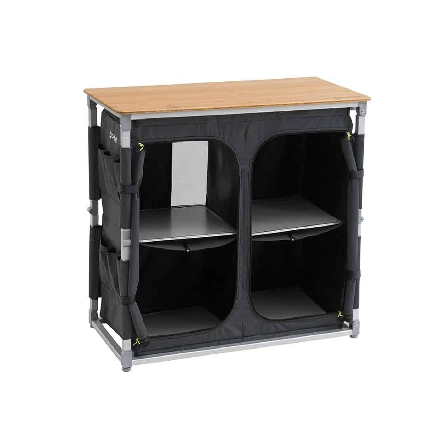 Tämä käytännöllinen säilytyskaappi avautuu ja taittuu muutamassa sekunnissa, mikä tekee siitä ihanteellisen leirintäelämää varten. Kaksi päätilaa, kuusi säilytystaskua ja vankka bambulevy päällä tarjoavat tehokkaan säilytysratkaisun. Kaapissa on verkkoa ilmanvaihdolle, joka estää kosteuden ja hajujen muodostumista, sekä ulosvedettävä teline pesuvadille. Voit käyttää pöytälevyä esimerkiksi keittiötasona ja mahdollisesti kaasupolttimelle.