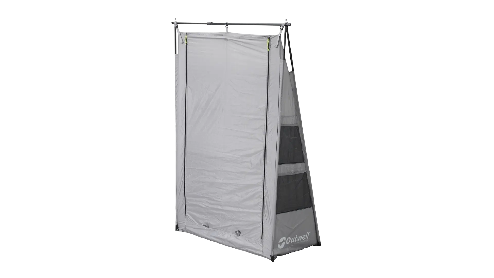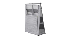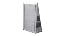 Vetoketjuovi suojaa varusteesi pölyltä ja kosteudelta. Pystysuora taustalevy ja kahdeksan käytännöllistä hyllyä varmistavat vakaan sijoittelun ja hyvän järjestelyn, kun taas kolmion muotoinen rakenne, kooltaan 150 x 55 cm, hyödyntää teltan tilan tehokkaasti. Kaksi ylimääräistä taskua antavat helpot pääsyn pikkuesineisiin leirintämatkan aikana.