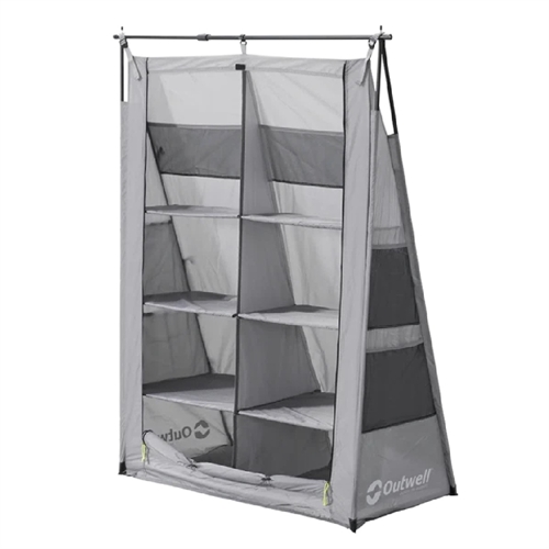 Oletko kyllästynyt etsimään varusteitasi? Tällä 150 cm korkealla hyllyllä käytät teltan tilan maksimaalisesti. Erityisesti suunniteltu ripustusjärjestelmä pitää hyllyn vakaana, vaikka hyllyt ovat täynnä.