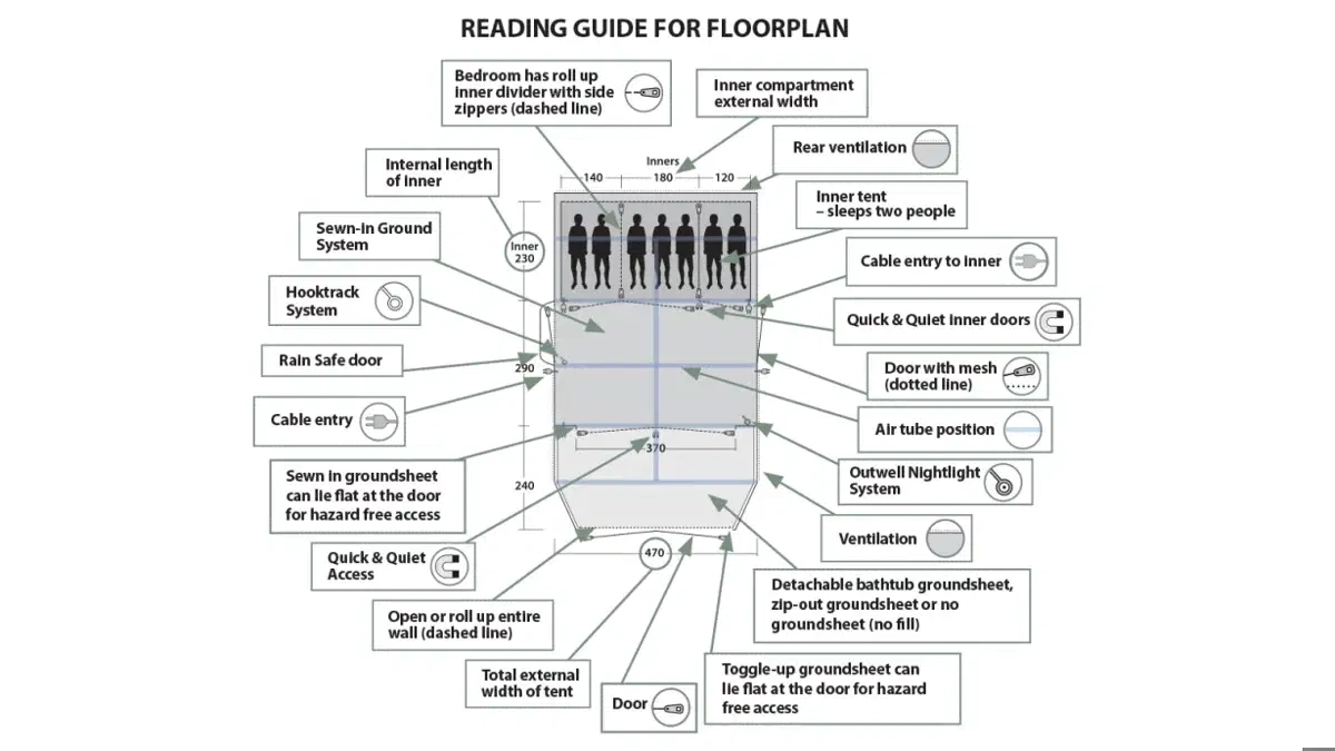 Suuri oleskelutila on varustettu korkeareunaisella pohjalla, joka pitää veden ulkopuolella äkillisen sateen sattuessa. Tumma sisäosa vähentää valon pääsyä aamuisin, mikä parantaa nukkumista myöhäisten iltojen jälkeen nuotion ääressä tai festivaalikonserttien jälkeen.