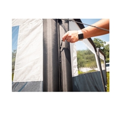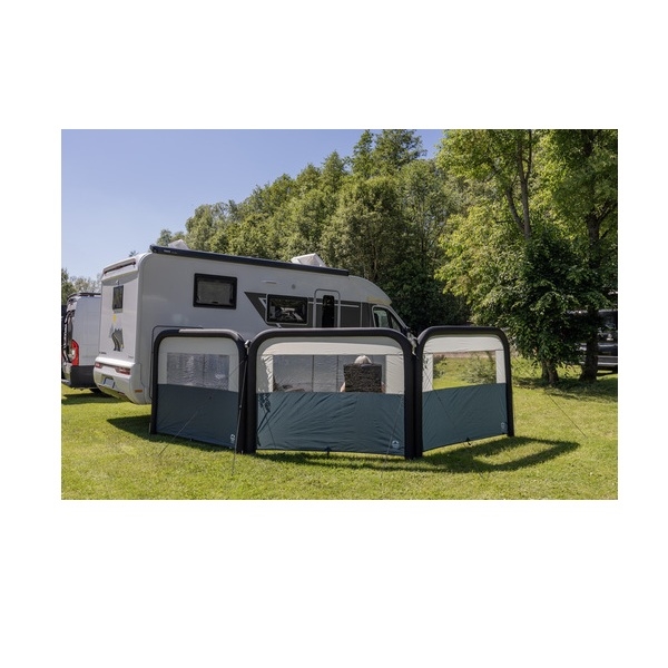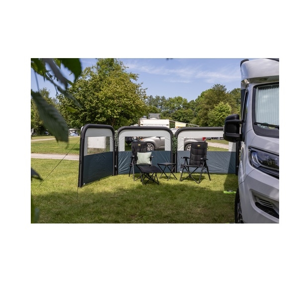 REIMO HELGOLAND AIR 400, Ilma Tuulensuoja, 400 x 155 cm, on suunniteltu tarjoamaan suojaa tuulelta ja luomaan yksityisyyttä ulkoalueelle. Tämä täytettävä tuulensuoja, jossa on kaksi osaa ja mustat rungot, asennetaan helposti mukana tulevalla ilmapumpulla eikä se vaadi tankoja. Sopii leirintään, puutarhaan tai rannalle, tämä tuulensuoja tarjoaa kätevän ratkaisun niille, jotka haluavat viettää enemmän aikaa häiriöttömästi ulkona. Jokaisen osan yläosassa olevat läpinäkyvät ikkunat tuovat luonnonvaloa, kun taas lisämoduulit voidaan helposti liittää vetoketjulla joustavuuden lisäämiseksi.