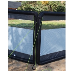 Täytettävä tuulensuoja vedellä kolmella paneelilla ja kirkkailla ikkunoilla, kiinnitetty naruilla.