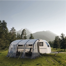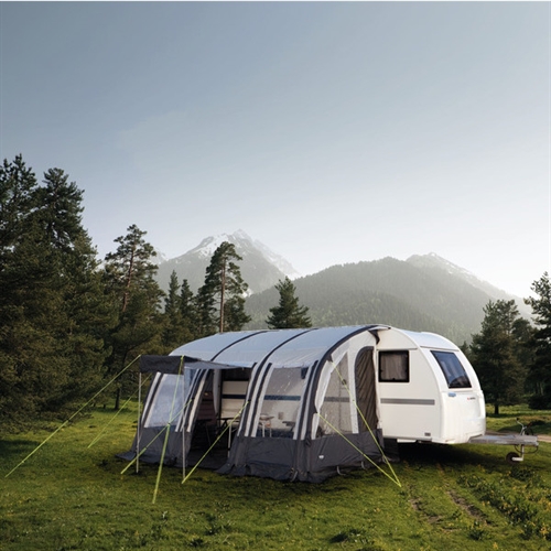 Kupolimuotoinen etuteltta asuntovaunun vieressä, vuorten ja puiden ympäröimänä, läpinäkyvillä ja verkkopaneeleilla.