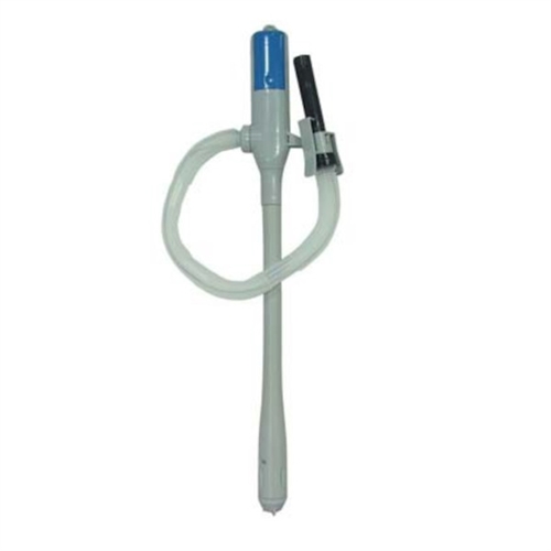 Akkukäyttöinen pumppu, jossa on sininen akkutila, joustava letku ja kiinnitysklipsi.