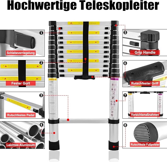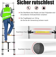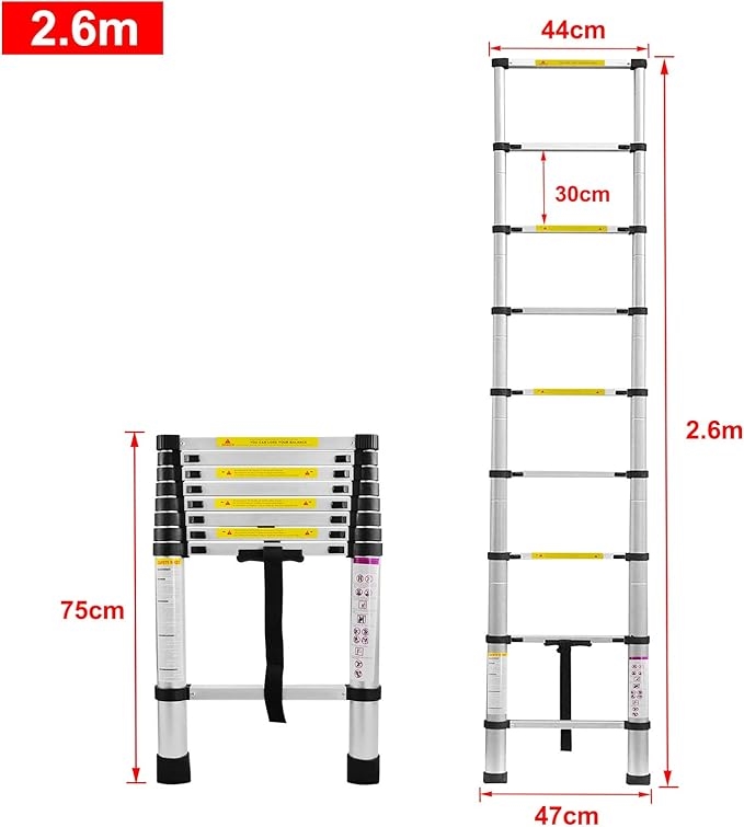Nämä teleskooppitikkaat tarjoavat turvallisen pääsyn korkeuksiin jopa 2,6 metriä, kun taas ne vievät vain 0,75 metriä tilaa taitettuna. 9 askelman ansiosta voit säätää tarkasti tarvitsemasi korkeuden – olipa kyseessä asuntoauto, asuntovaunu tai koti. Jokainen askelma lukittuu automaattisesti, joten tikkaat eivät voi taittua vahingossa käytön aikana. Alumiinirakenne on ruostumaton ja kestää 150 kg, mikä antaa tilaa sinulle ja työkaluillesi.
