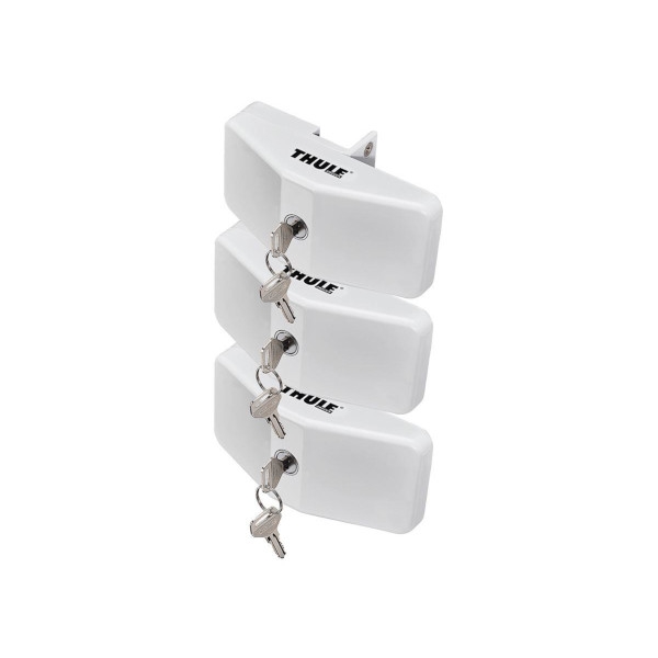 Kolme valkoista Thule-kehyslukkoa pinottuina, jokaisella avaimet. Kompakti, suorakulmainen muotoilu Thule-logolla.