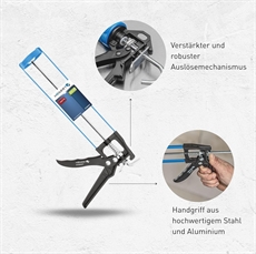 Vahvaa laatua oleva saumauspistooli on valmistettu mustaksi ja siniseksi maalatusta teräksestä, mikä suojaa ruosteelta ja sään vaikutuksilta ulkotöissä. Suunniteltu standardikokoisille 310 ml saumauspatruunoille, mikä takaa yhteensopivuuden yleisten patruunoiden kanssa. Portaaton toiminto tarkkaa levitystä varten antaa täyden hallinnan saumausmassan virtaukseen, joten voit säätää nopeutta tehtävän vaatimusten mukaan - hitaasti ja tarkasti yksityiskohtatyöhön tai nopeammin suuremmille pinnoille.