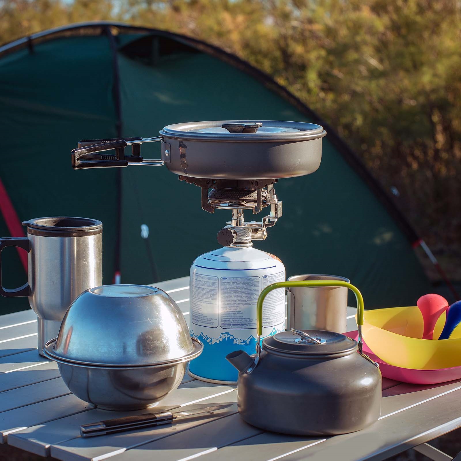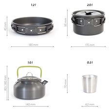 • Sisältää: kattila, pannu, vedenkeitin, kokeilu, kaksi kuppia, kaksi lusikkaa, kaksi veistä, kaksi haarukkaa
