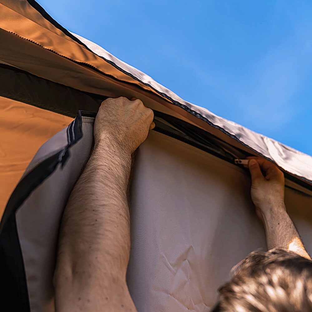 Tämä sivuosat Texel aurinkopurjeellesi luo suojatun oleskelutilan, joka estää suurimman osan tuulesta – ratkaisevaa, kun tarvitset mukavuutta tuulisissa leiriolosuhteissa. Sivupaneelit ovat vedenpitäviä, joten voit jatkaa ulkoalueesi käyttöä jopa sateella, ja leirivarusteesi pysyvät kuivina. Vetoketjujärjestelmä tekee pystytyksestä ja purkamisesta nopeaa, mikä on kätevää leiripaikan vaihdossa. Jokaisessa paneelissa on pyöreä ikkuna, joka varmistaa valon ja näkymän.