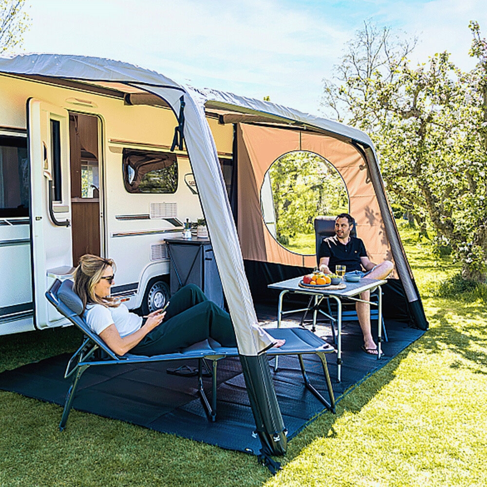 Sivupaneelien kokonaispaino on 4,64 kg, mikä tekee niistä helppokuljetettavia leirintämatkoilla. Polyesterimateriaali on säänkestävä ja nopeasti kuivuva sateen jälkeen, joten sinun ei tarvitse odottaa kauan ennen seuraavaa käyttöä. Jokaisen paneelin pyöreä ikkuna antaa luonnonvaloa ilman, että suoja tuulelta ja säältä kärsii. Beige ja mustat värit sopivat useimpiin matkailuvaunuihin.