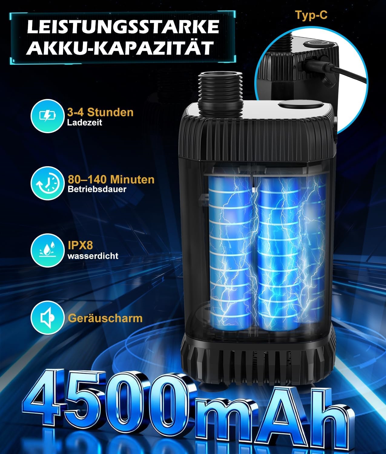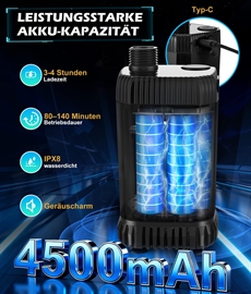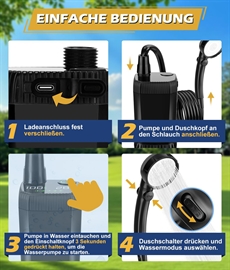 • Pakkauksen sisältö: Upotuspumppu, suihkupää, taitettava ämpäri, laturi, kiinnityskoukku