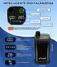 Ruostumattomasta teräksestä 201 ja paksuista kuparijohdoista valmistettu rakenne takaa kestävyyden ulkona. LED-näyttö näyttää akun tilan ja valitun suihkutilan reaaliajassa, jotta voit suunnitella käyttöä. Suihkun päässä on 3 suihkutyyppiä ja vesipysäytystoiminto – irrota pää intensiivisuihkutilaa varten suolan ja hiekan huuhteluun rannalla. 3-in-1 koukku tarjoaa joustavan asennuksen matkailuvaunuihin tai autoihin.