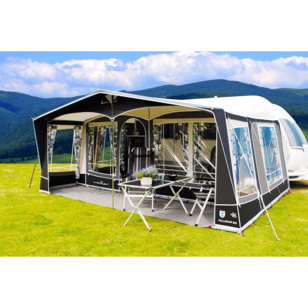Teltta on kokonaan antrasiitin värinen, ja sen kulmat ja reunat ovat valkoiset. Palladium 350 on suunniteltu erityisesti seisomaleiriläisille, ja se on valmistettu Ten Caten vahvasta ympärivuotisesta telttakankaasta. Teltan syvyys on 350 cm. Teltan etuosassa on 2 itsenäistä paneelia, joita voidaan siirtää, niin sanottu Easy-Door. Etupaneelit voidaan myös siirtää teltan sisälle, jolloin teltan syvyys on 240 cm ja teltan ulkonema 110 cm.