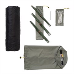 Tunneliteltta kolmelle hengelle, näkyvä sisäänkäynti ja vakauden takaavat kanavissa olevat tangot.