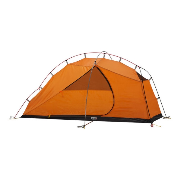 Pieni harmaa teltta yhdelle henkilölle oranssilla sisustuksella ja eteisellä varusteiden säilytykseen.