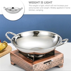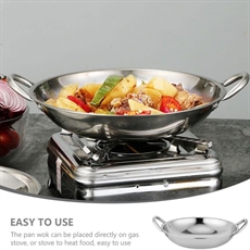 Ruostumattomasta teräksestä valmistettu wok-pannu, jossa on kaksoiskahvat.